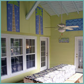 My client knew she would be selling the Island Dog, so we did a quick refresh of the Back Porch-- new paint on walls, floor, ceiling, trim and furniture... and fresh new curtains, pillows and slipcovers.