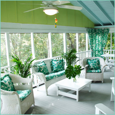 My client knew she would be selling the Island Dog, so we did a quick refresh of the Back Porch-- new paint on walls, floor, ceiling, trim and furniture... and fresh new curtains, pillows and slipcovers.